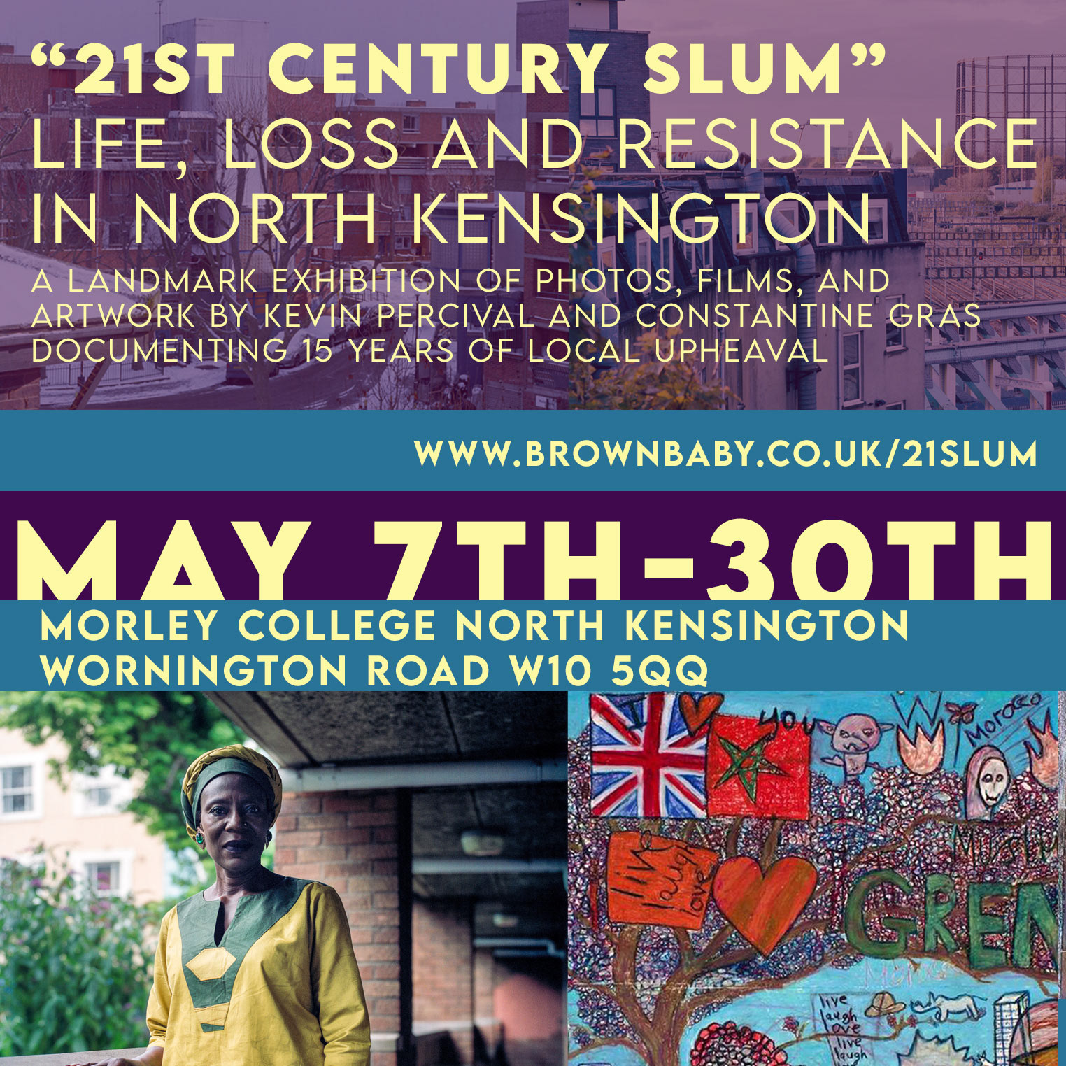 Brownbaby and Morley Gallery North Kensington presents an exhibition of landmark photos, films, and artwork by Kevin Percival and Constantine Gras documenting 15 years of local upheaval. Spanning the Silchester, Lancaster West, and Wornington Green Estates, the show captures the lived experience of a community navigating gentrification and the 2017 Grenfell Tower fire that resulted in the loss of 72 lives.